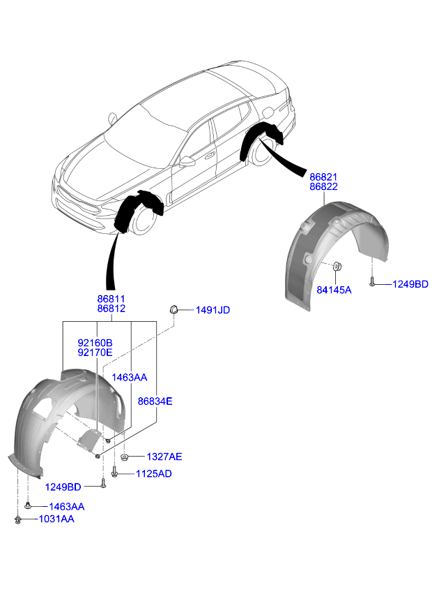 Parts meeting the search criteria : KIA Stinger 2020 3300 CC LAMBDA 2 RH FRONT WHEELHOUSE LINER 86812J5010